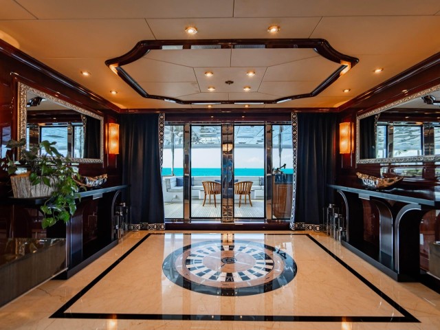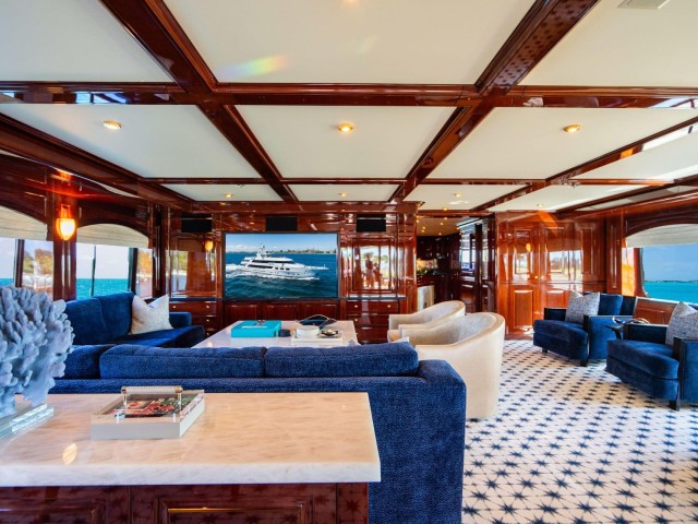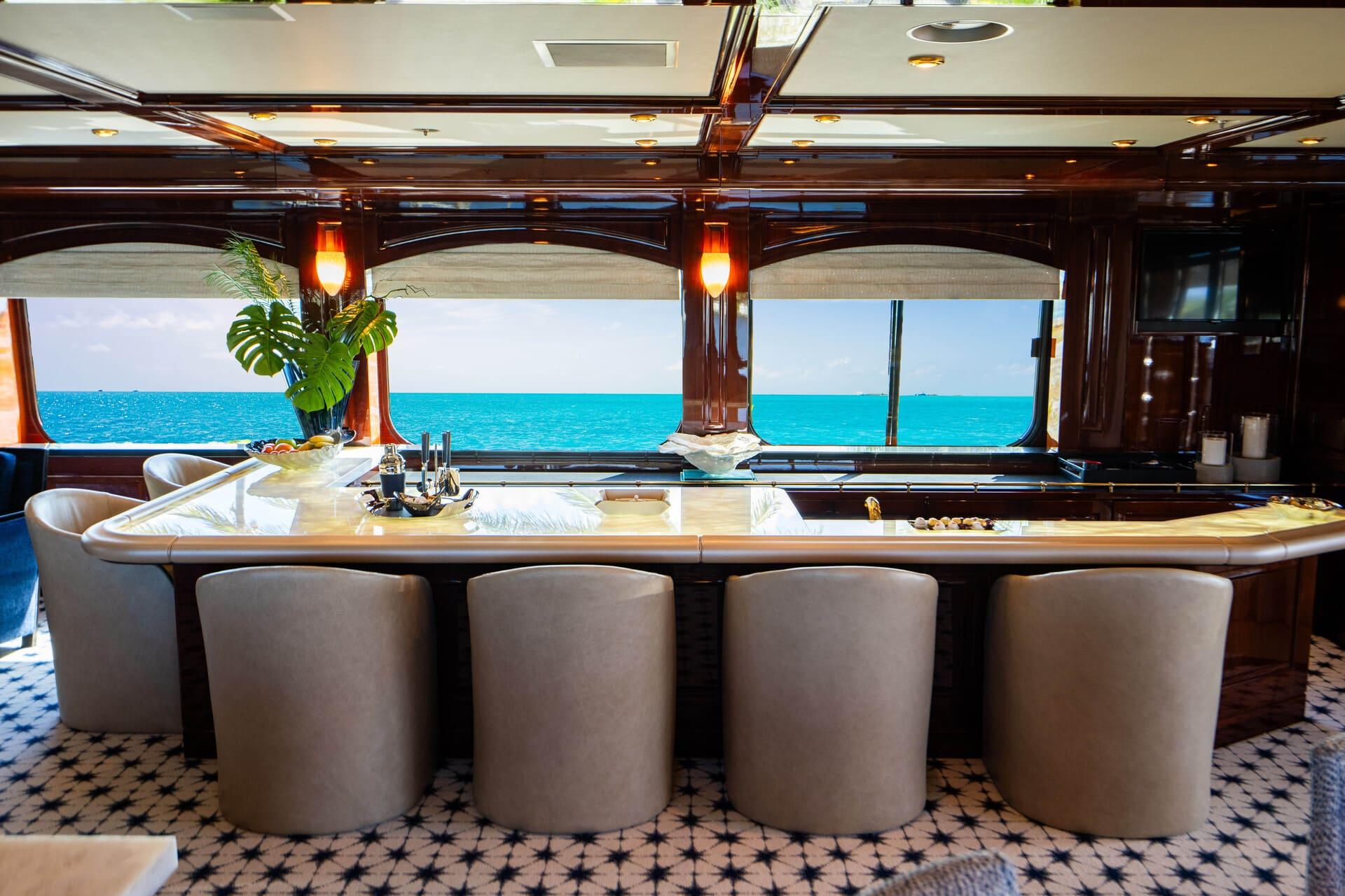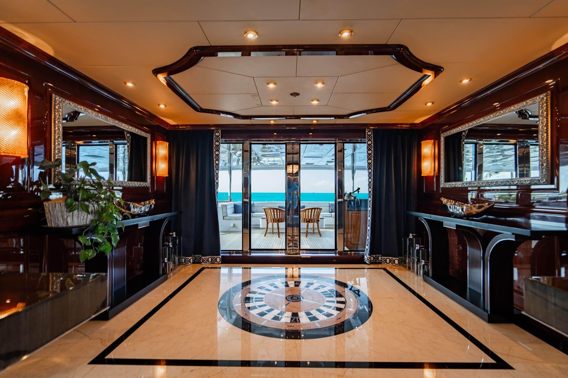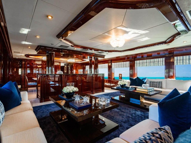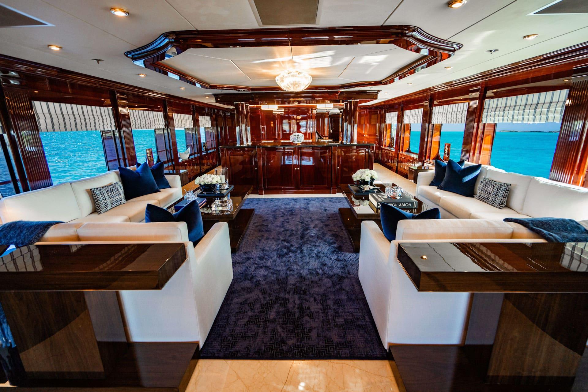 Life aboard Lady Elaine flows effortlessly from one space to the next. The main salon is opulent yet inviting, featuring generous lounge areas and a striking double-sided television that elegantly separates the salon from the formal dining room. This refined dining space welcomes twelve guests for unforgettable meals, framed by a graceful foyer that sets the tone upon arrival. Above, the skylounge offers a glamorous social setting with plush seating, panoramic views, and a stunning illuminated onyx bar that instantly becomes the heart of evening gatherings.
