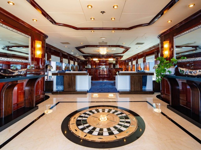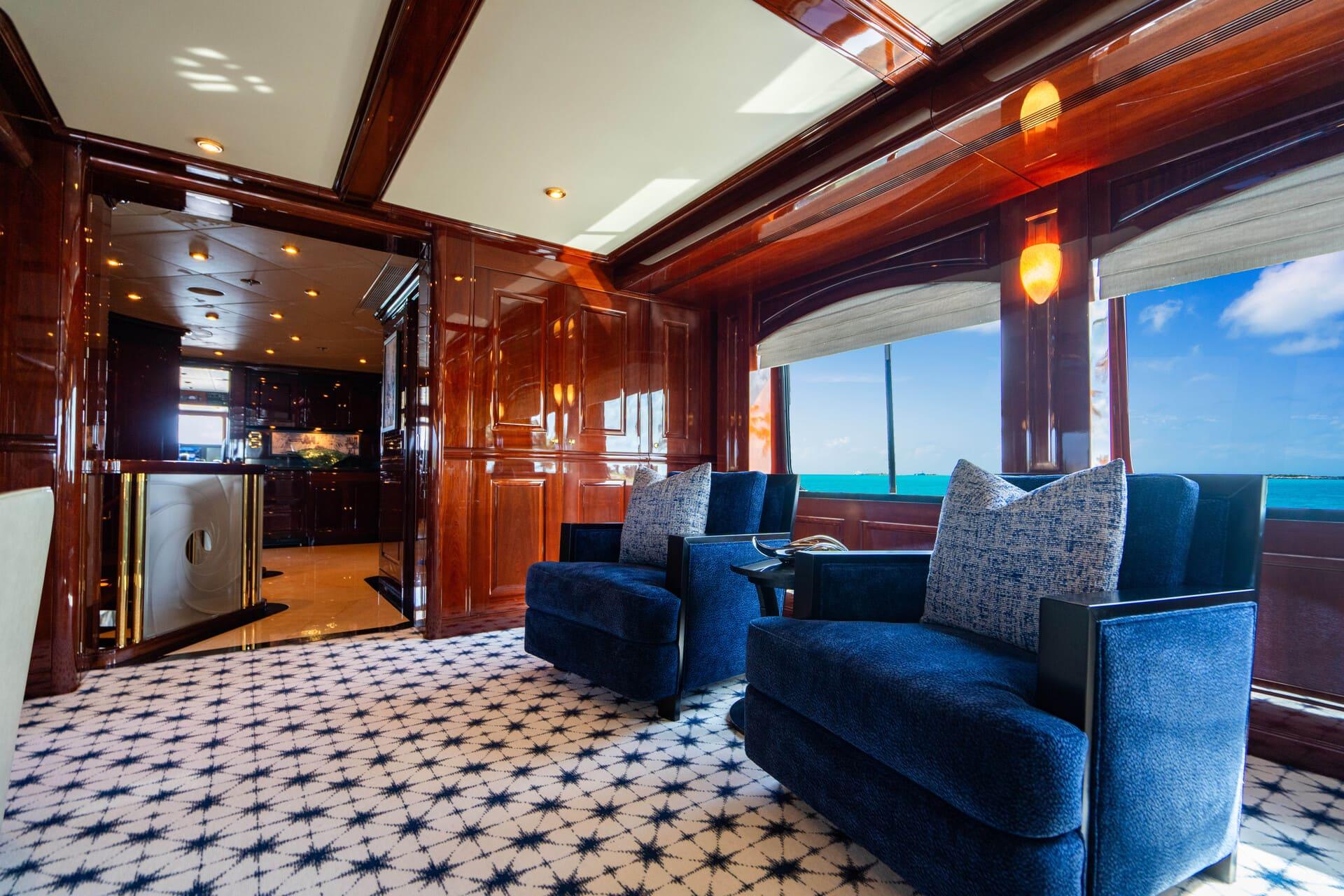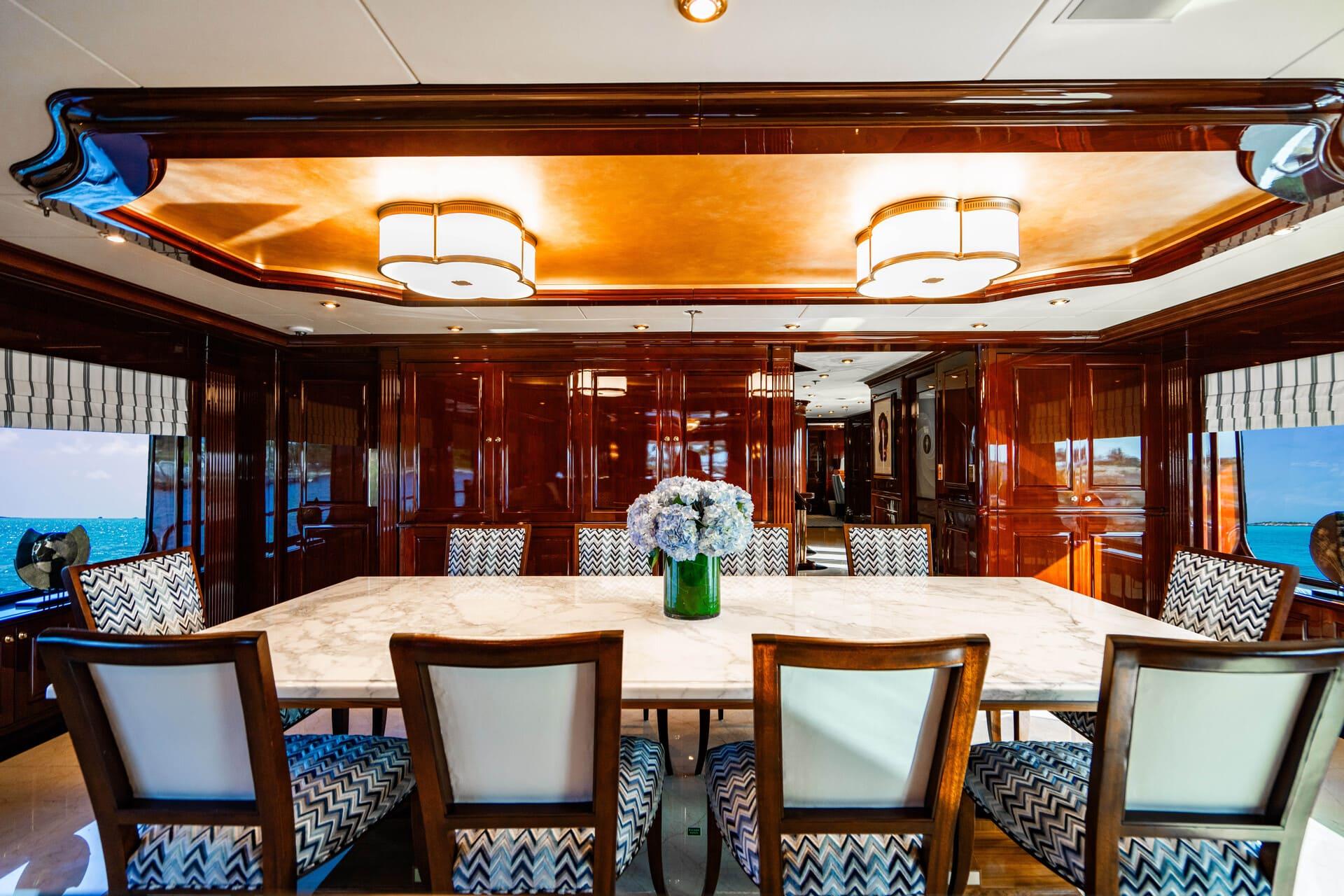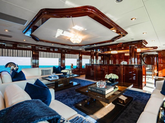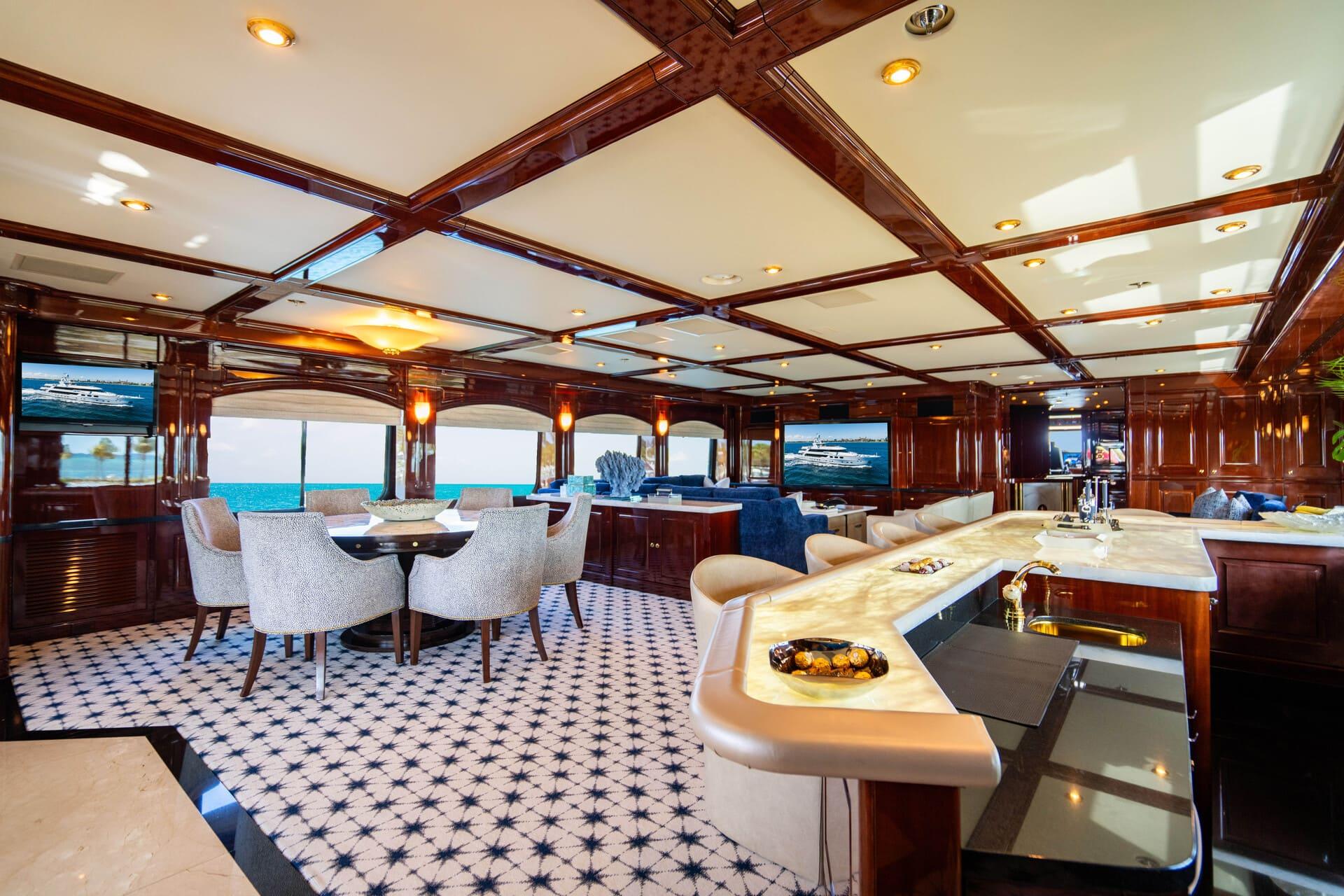 Life aboard Lady Elaine flows effortlessly from one space to the next. The main salon is opulent yet inviting, featuring generous lounge areas and a striking double-sided television that elegantly separates the salon from the formal dining room. This refined dining space welcomes twelve guests for unforgettable meals, framed by a graceful foyer that sets the tone upon arrival. Above, the skylounge offers a glamorous social setting with plush seating, panoramic views, and a stunning illuminated onyx bar that instantly becomes the heart of evening gatherings.