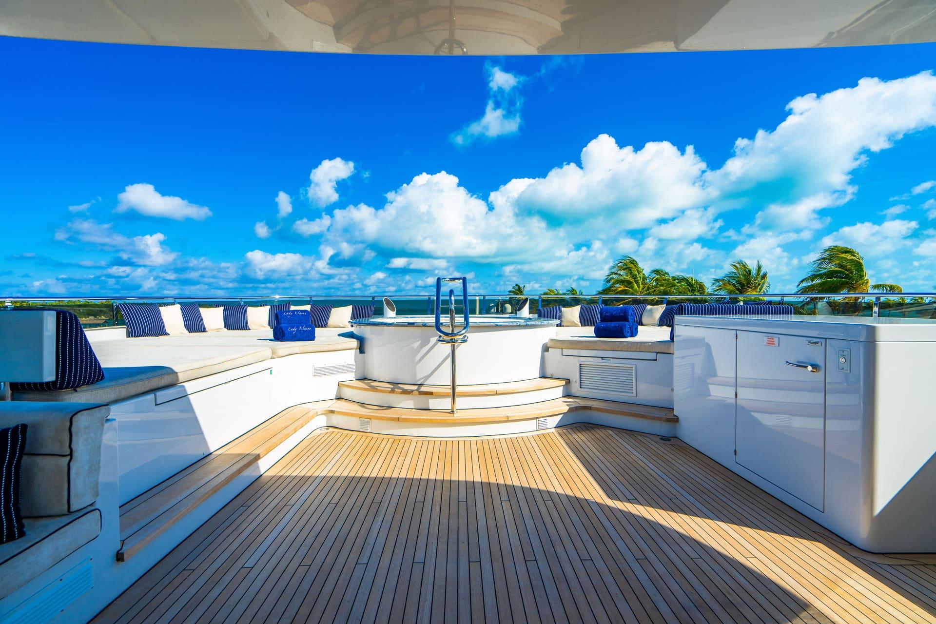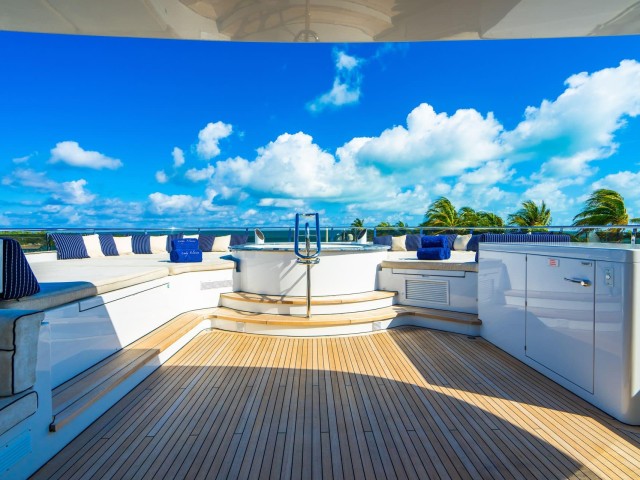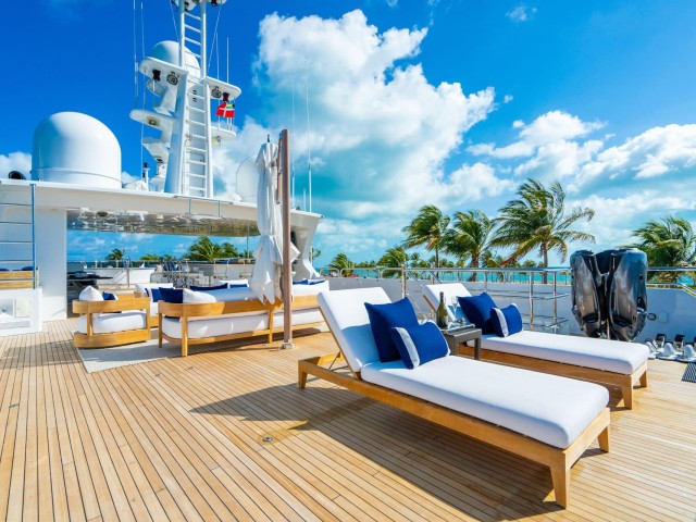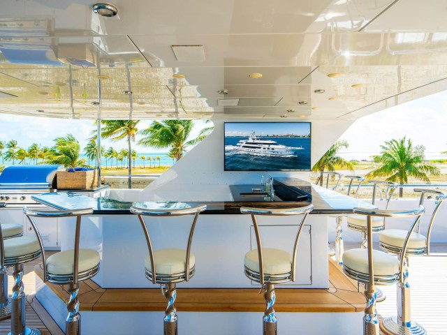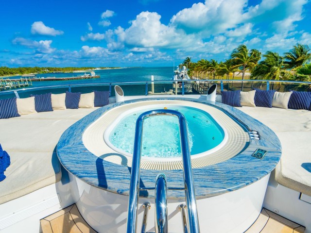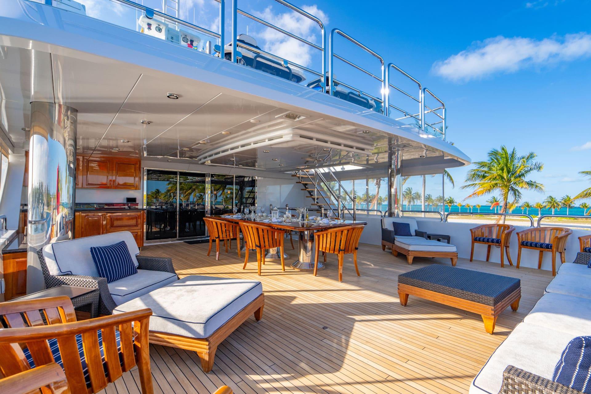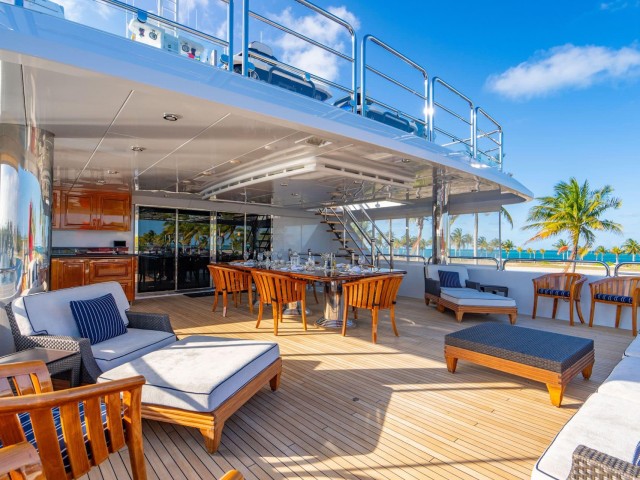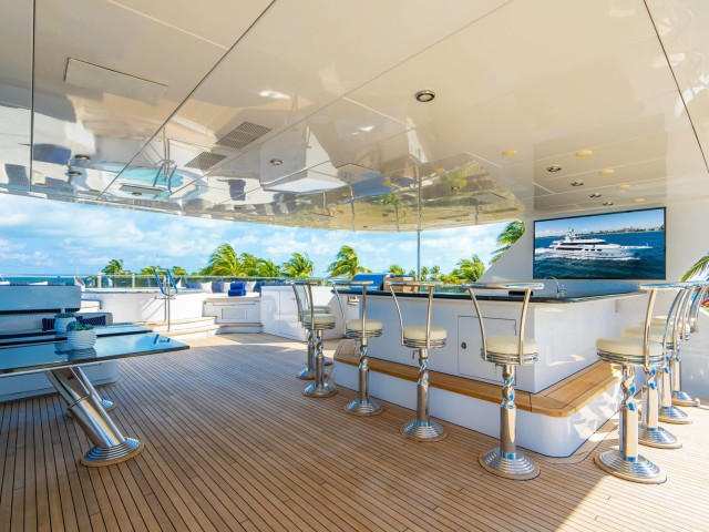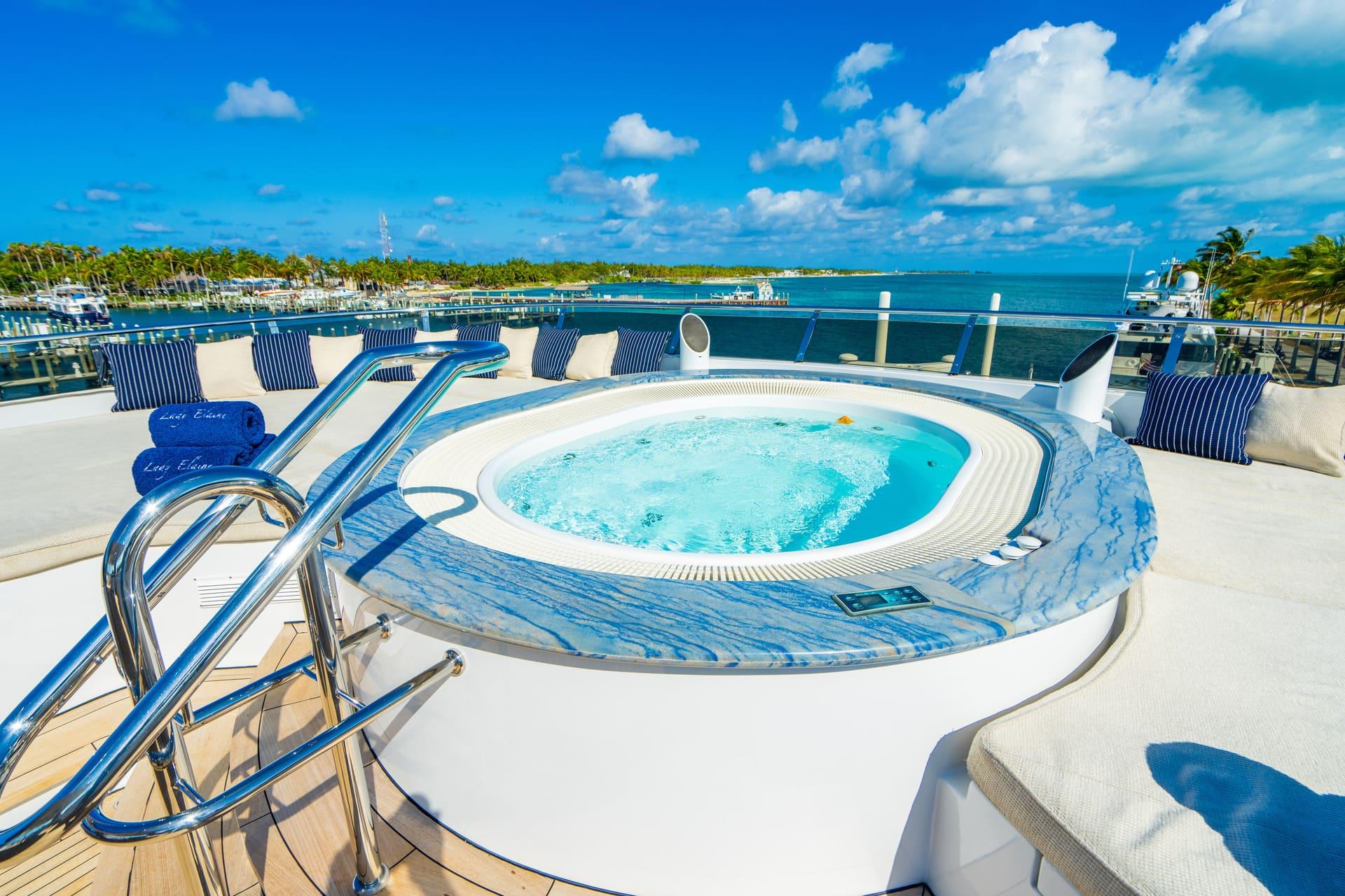 Lady Elaine’s exterior spaces are designed for connection, celebration, and relaxation. The aft deck offers comfortable social seating and easy access to the swim platform, making it a natural gathering point throughout the day. On the skylounge deck, an extra-wide alfresco dining table invites long, leisurely meals with sea views, while soft seating areas encourage relaxed conversation. The expansive sun deck is the ultimate playground, featuring a private ten-person Jacuzzi surrounded by sun pads, a full bar with seating for ten, a barbecue grill, and multiple lounging areas. With air conditioning and heating, this deck can be enjoyed comfortably at any time of day or night.