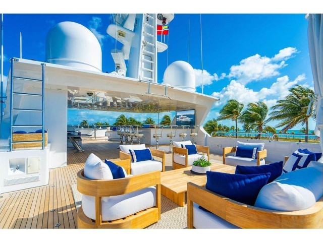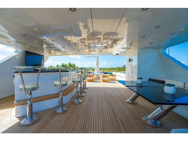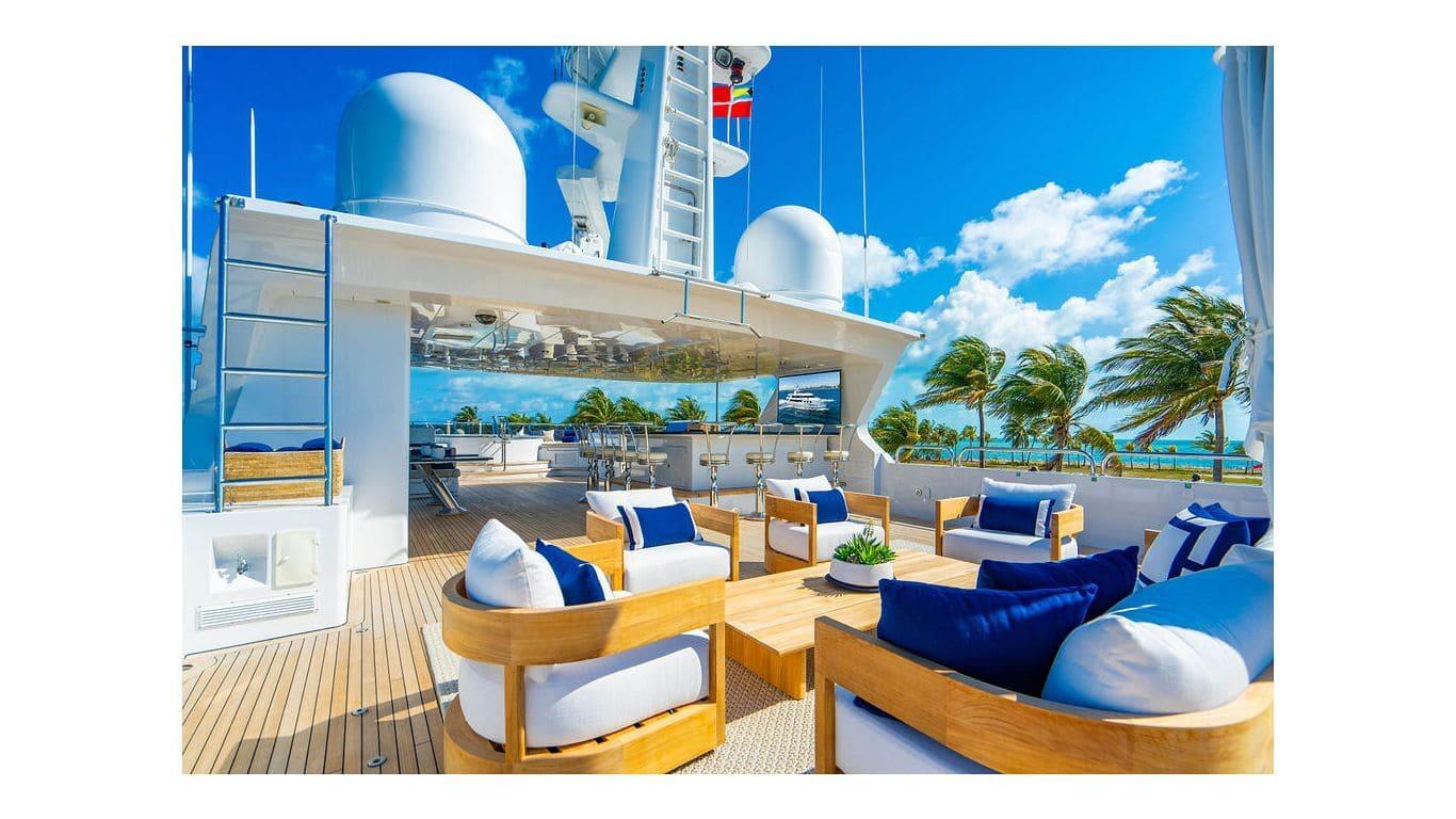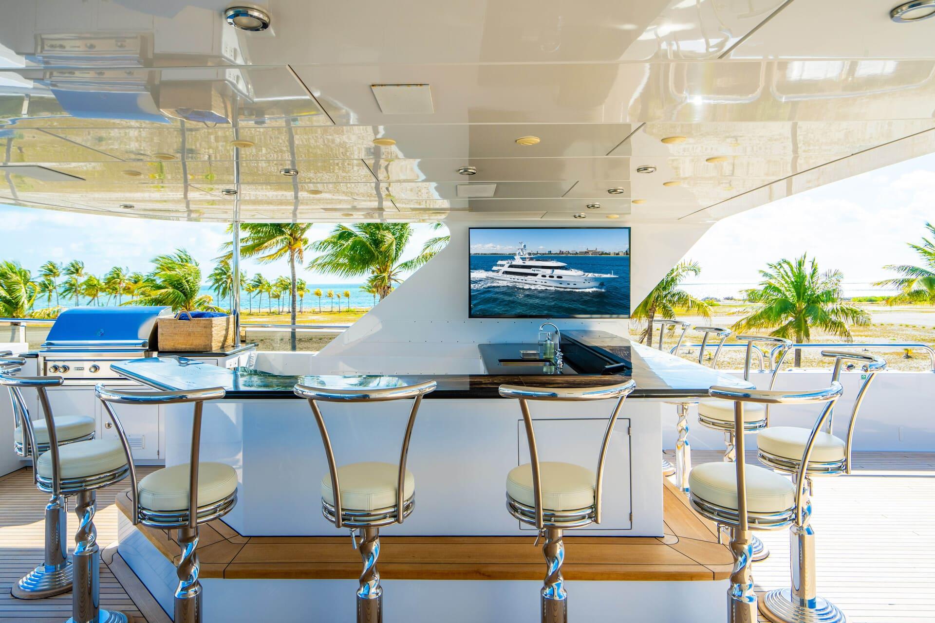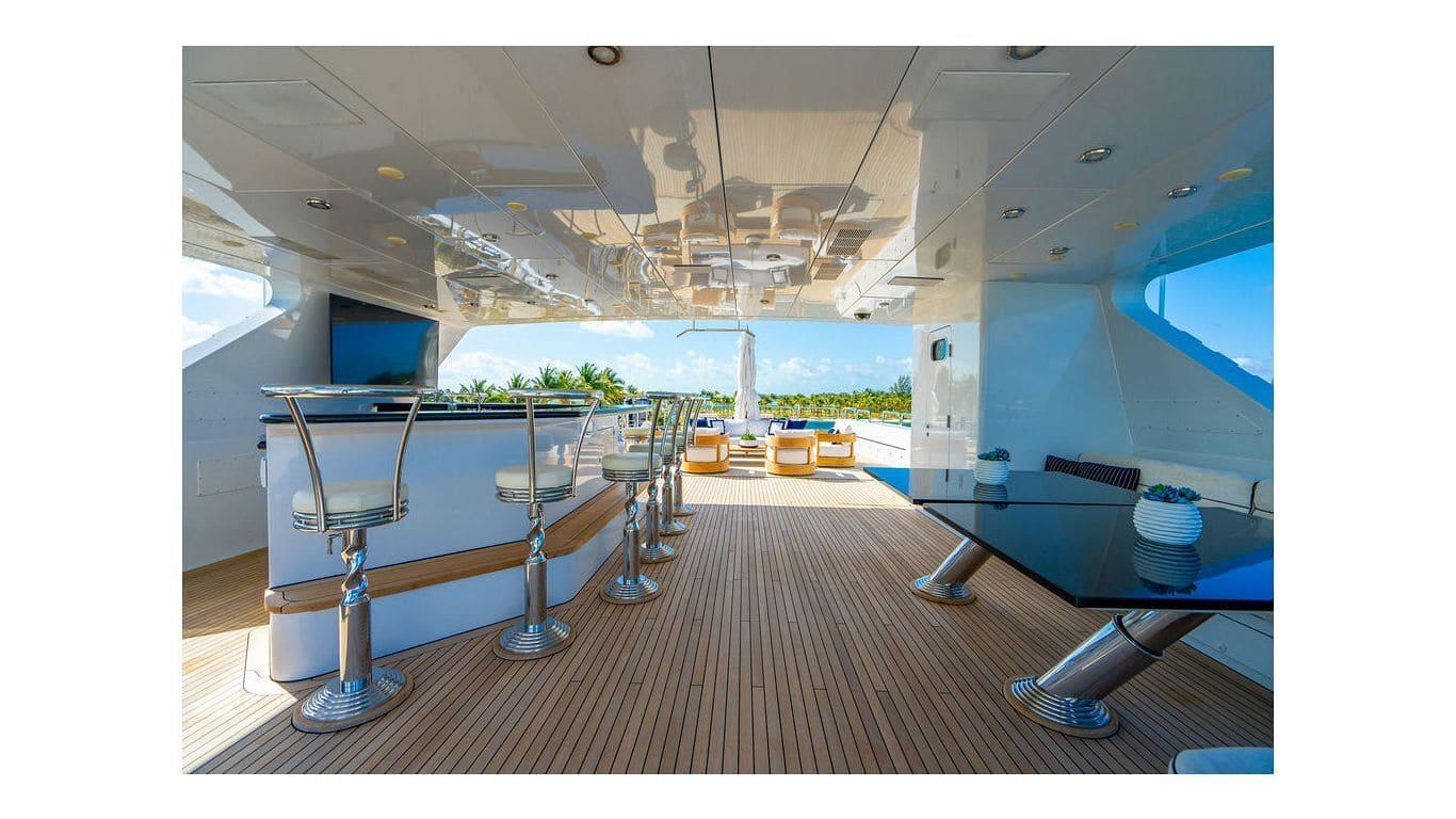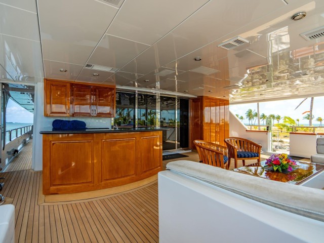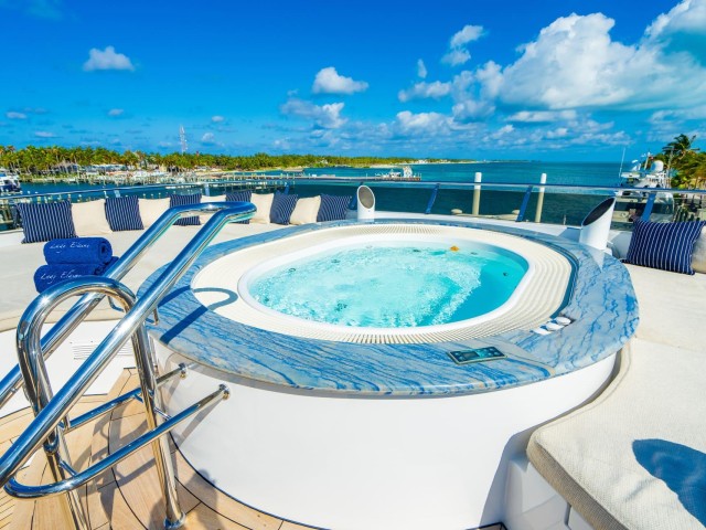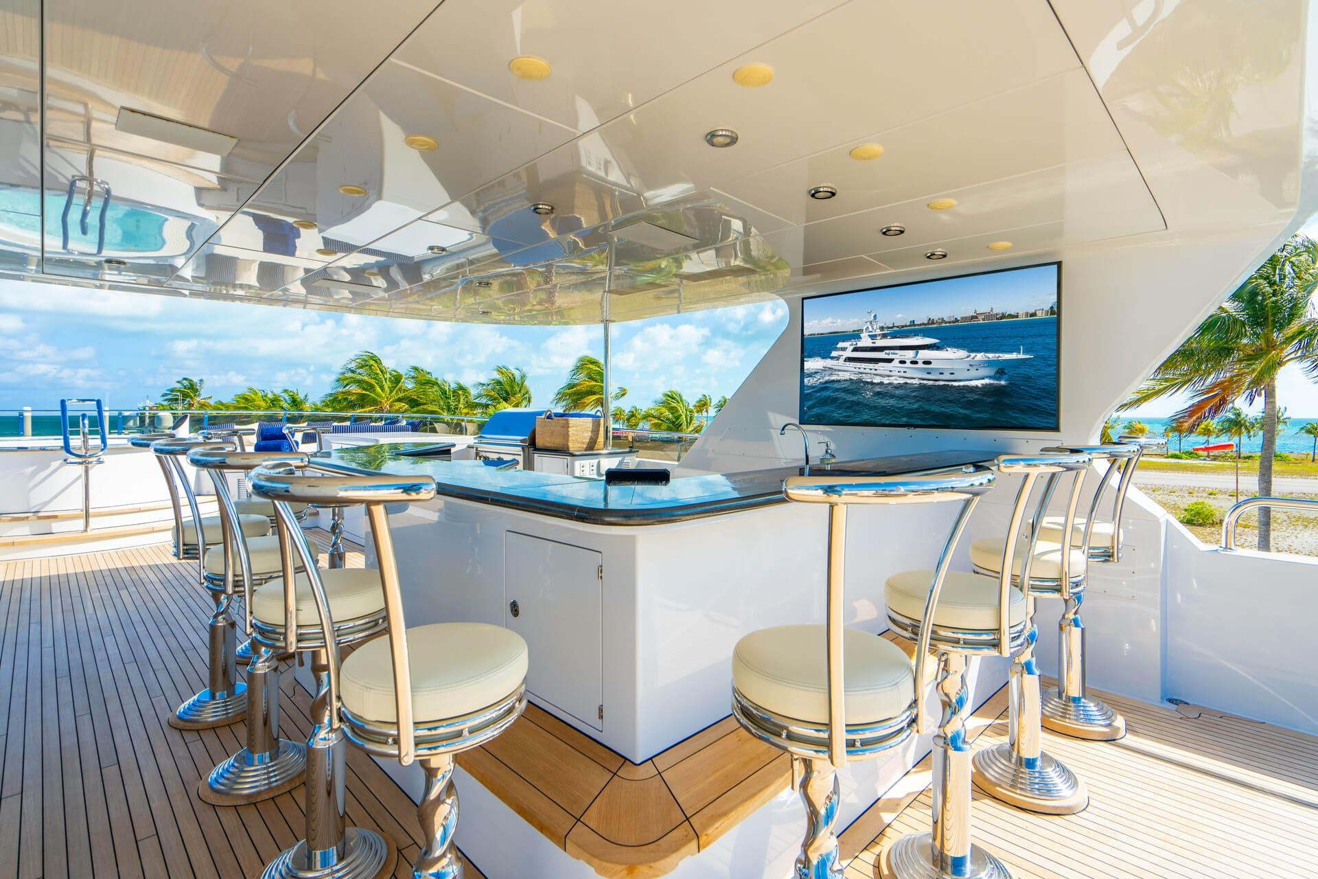 Lady Elaine’s exterior spaces are designed for connection, celebration, and relaxation. The aft deck offers comfortable social seating and easy access to the swim platform, making it a natural gathering point throughout the day. On the skylounge deck, an extra-wide alfresco dining table invites long, leisurely meals with sea views, while soft seating areas encourage relaxed conversation. The expansive sun deck is the ultimate playground, featuring a private ten-person Jacuzzi surrounded by sun pads, a full bar with seating for ten, a barbecue grill, and multiple lounging areas. With air conditioning and heating, this deck can be enjoyed comfortably at any time of day or night.