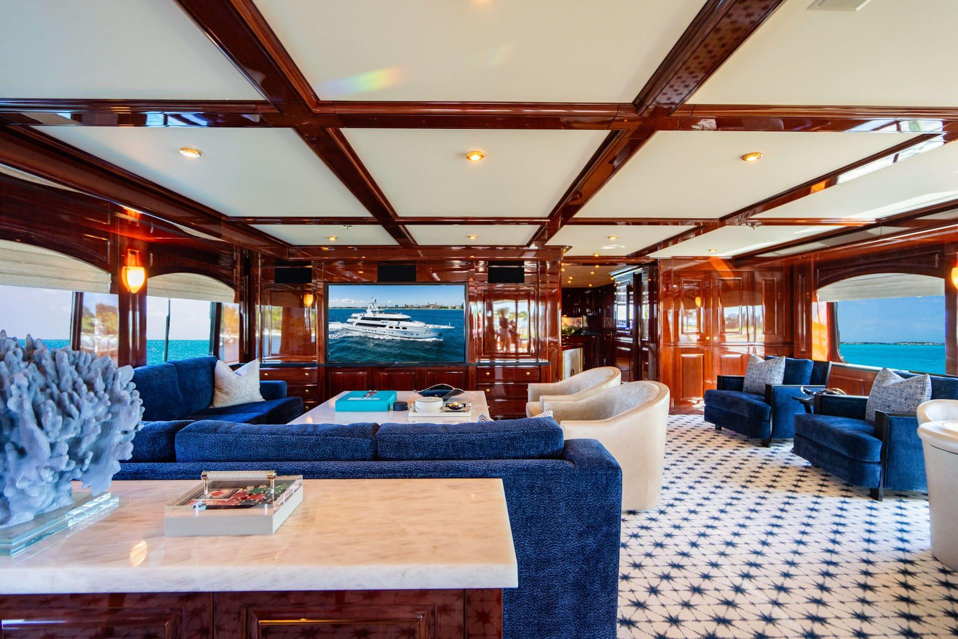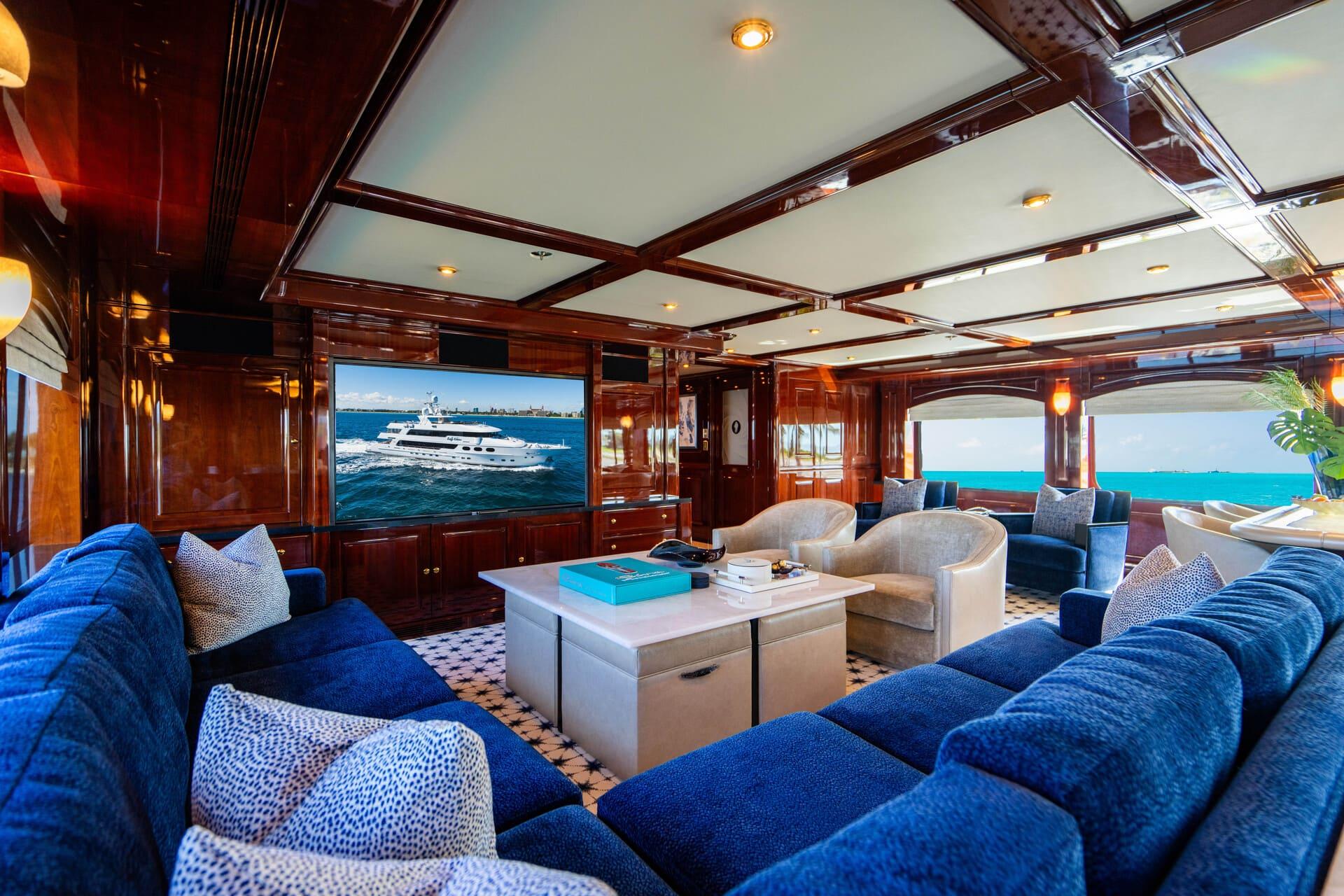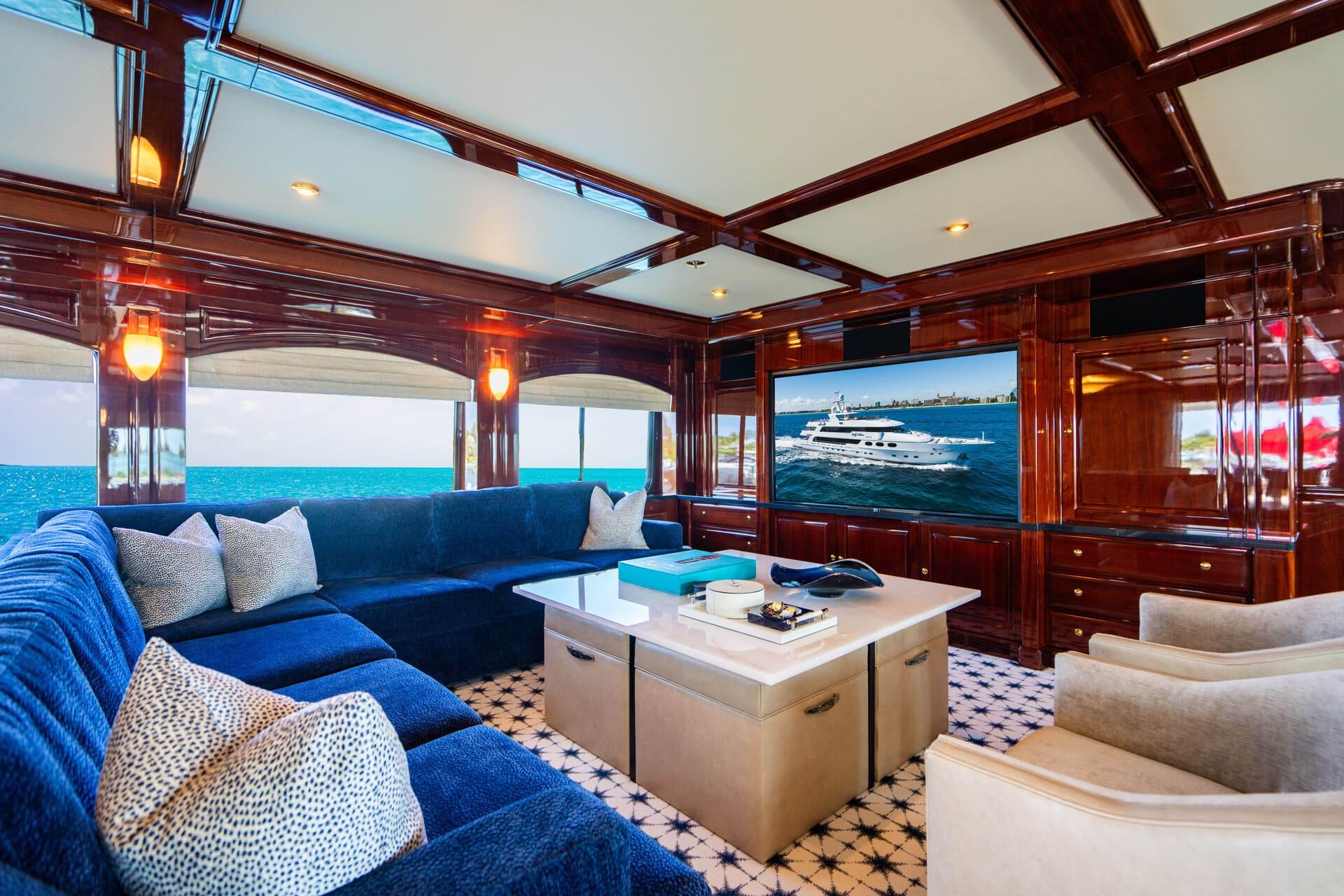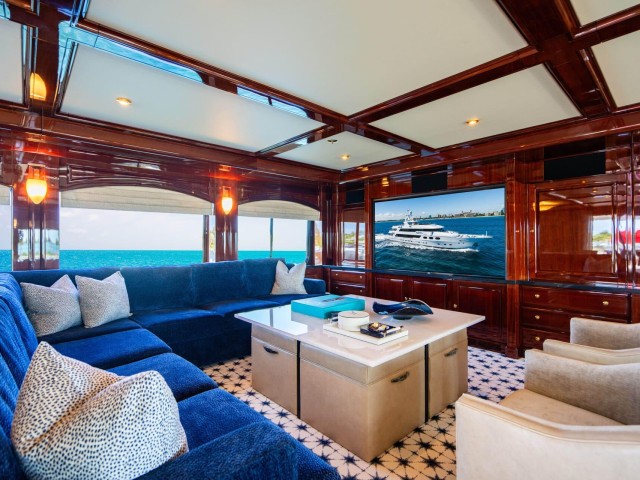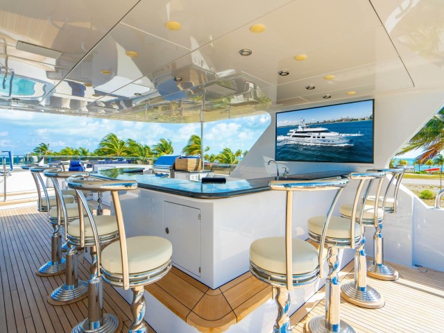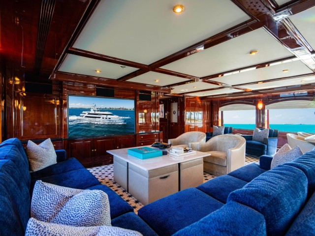Entertainment is a defining feature aboard Lady Elaine. A state-of-the-art Crestron audiovisual system and a Kaleidescape server with over 4,500 movies ensure endless viewing options, while surround sound throughout the main areas enhances every experience. Karaoke lovers will find their perfect stage on the sun deck, where more than 4,500 songs transform evenings into lively celebrations under the stars. Multiple flat-screen televisions and iPod docking stations throughout the yacht allow guests to enjoy their favorite music and media wherever they choose.