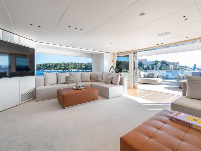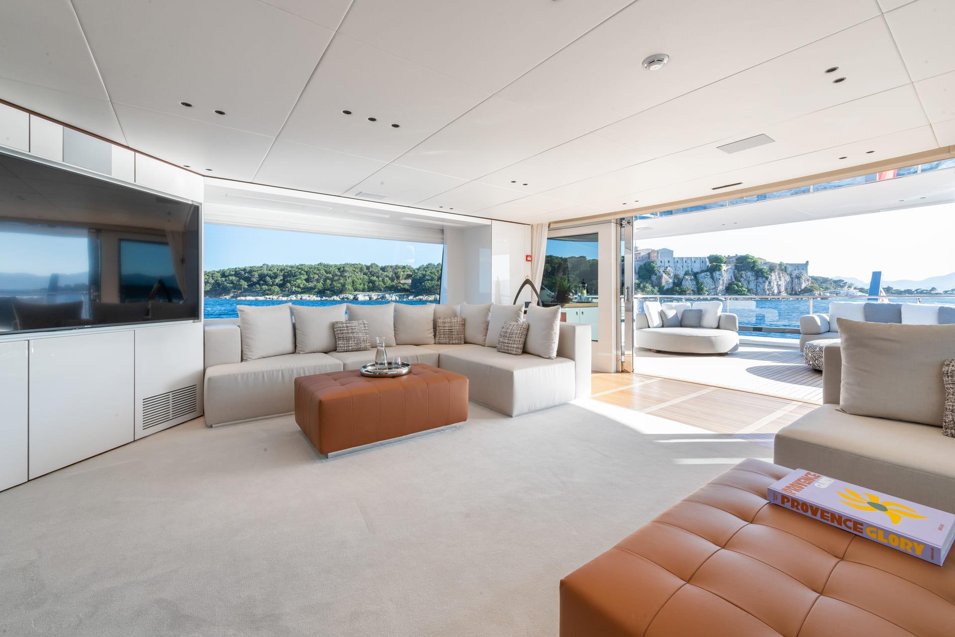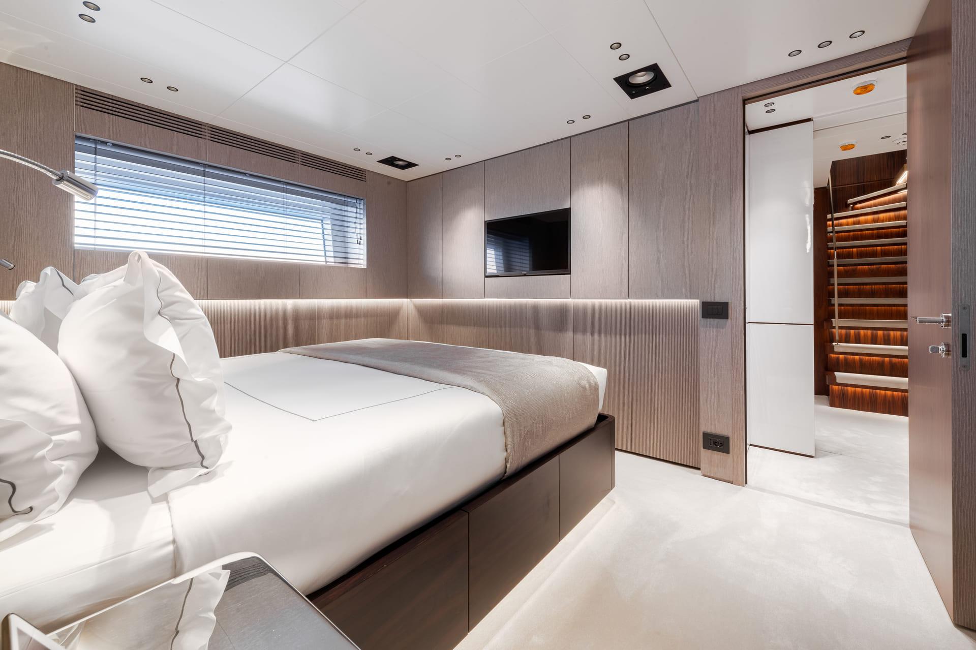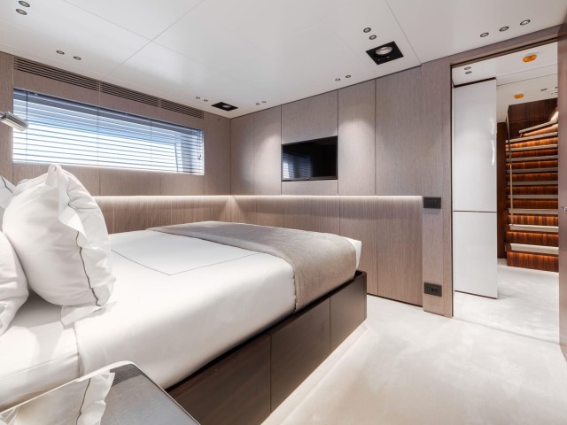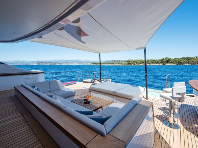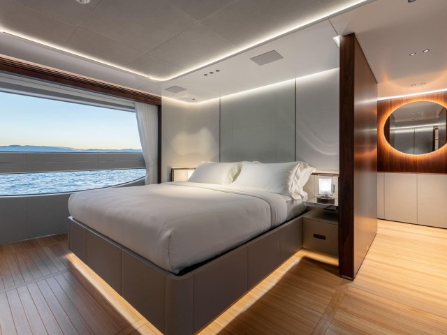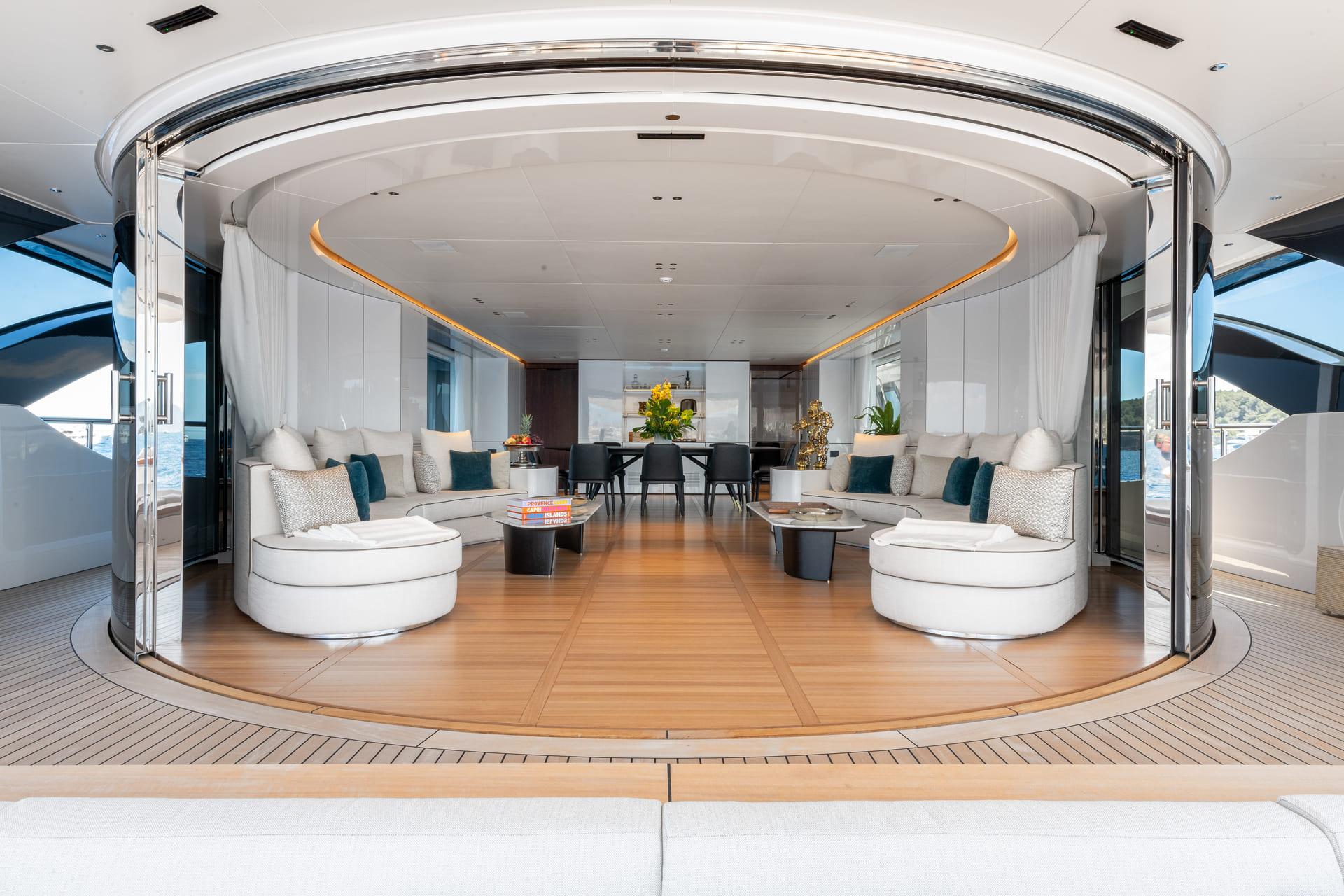 The bridge deck offers a private and elevated retreat. The sky lounge features plush seating, a full bar, and a large screen, making it ideal for movie nights or relaxed afternoons. Forward, the modern wheelhouse provides panoramic views while cruising, inviting guests to experience the journey itself. The exterior bow lounge offers an additional space for aperitifs or sunbathing in complete privacy, while the sundeck crowns the yacht with a Jacuzzi, expansive sunpads, a teppanyaki grill, bar, and alfresco dining for twelve, perfect for long lunches or unforgettable evenings under the stars.