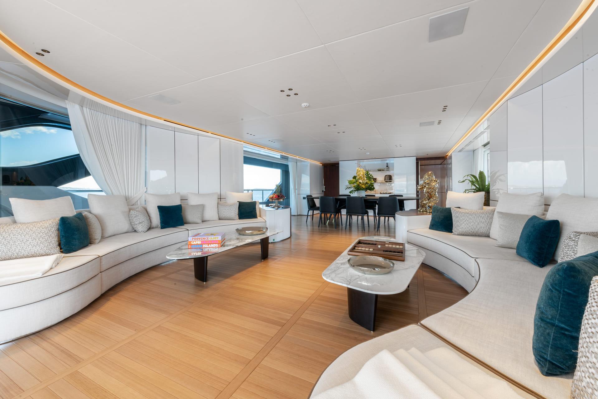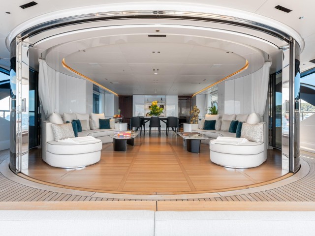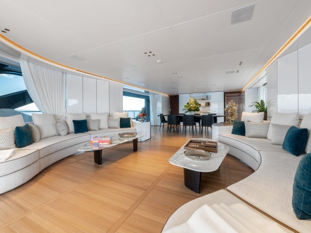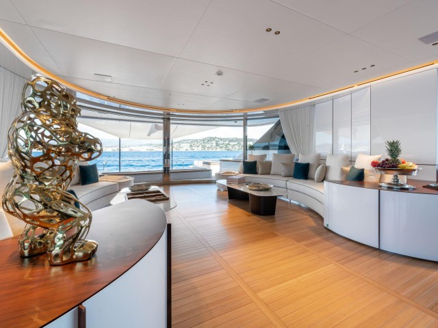 Northern Escape’s main deck is the heart of the yacht and sets the tone for life on board. The expansive beach terrace blends effortlessly with the sea, featuring an infinity pool at water level, fold-down side terraces, sun loungers, relaxed seating areas, and a bar with barbecue. This immersive beach club environment allows guests to move effortlessly between swimming, sunbathing, and socializing, creating an unrivaled connection to the ocean. Inside, the main salon is bright and inviting, with circular sofas, elegant coffee tables, and a refined dining area for up to twelve guests, complemented by wine cellars and chilled storage for effortless entertaining.