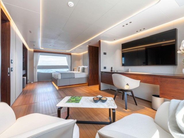 Northern Escape accommodates up to twelve guests in a thoughtfully designed layout that adapts to every charter style. The full-beam owner’s suite on the main deck is a private sanctuary with a lounge area, office desk, dressing space, and his-and-hers bathrooms, one featuring a steam shower. Two VIP cabins offer elegant comfort with ensuite shower rooms, while two convertible twin cabins with additional Pullman beds provide excellent flexibility for families or mixed groups. A dedicated wellness cabin on the main deck can function as a massage room or be converted into an additional cabin with fold-down Pullmans for children or staff, ensuring privacy and adaptability for every charter.
