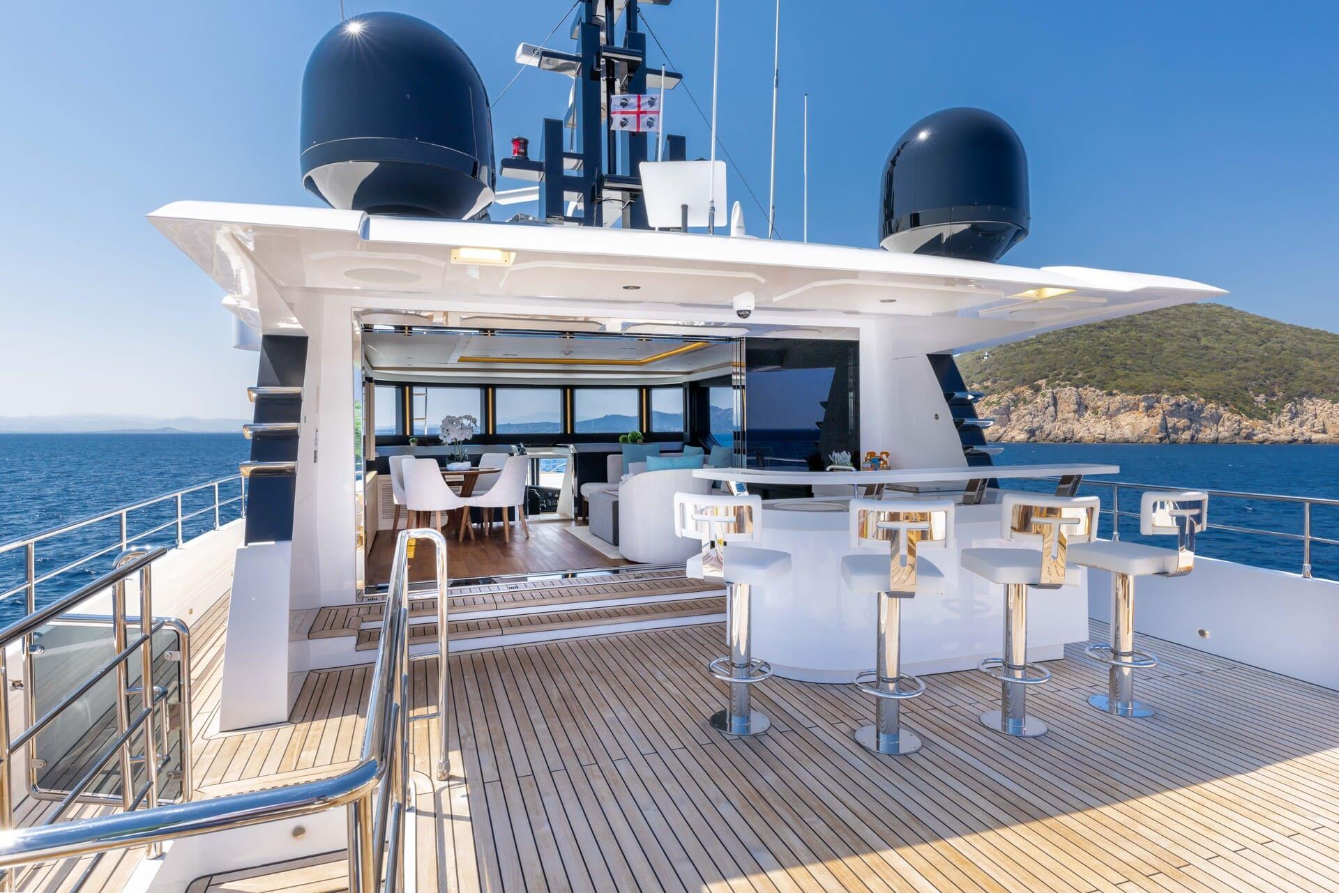 At the stern, a hydraulic swim platform provides easy access to the crystal-clear waters, making it effortless for guests to enjoy swimming, snorkeling, or launching the yacht’s impressive collection of water toys.