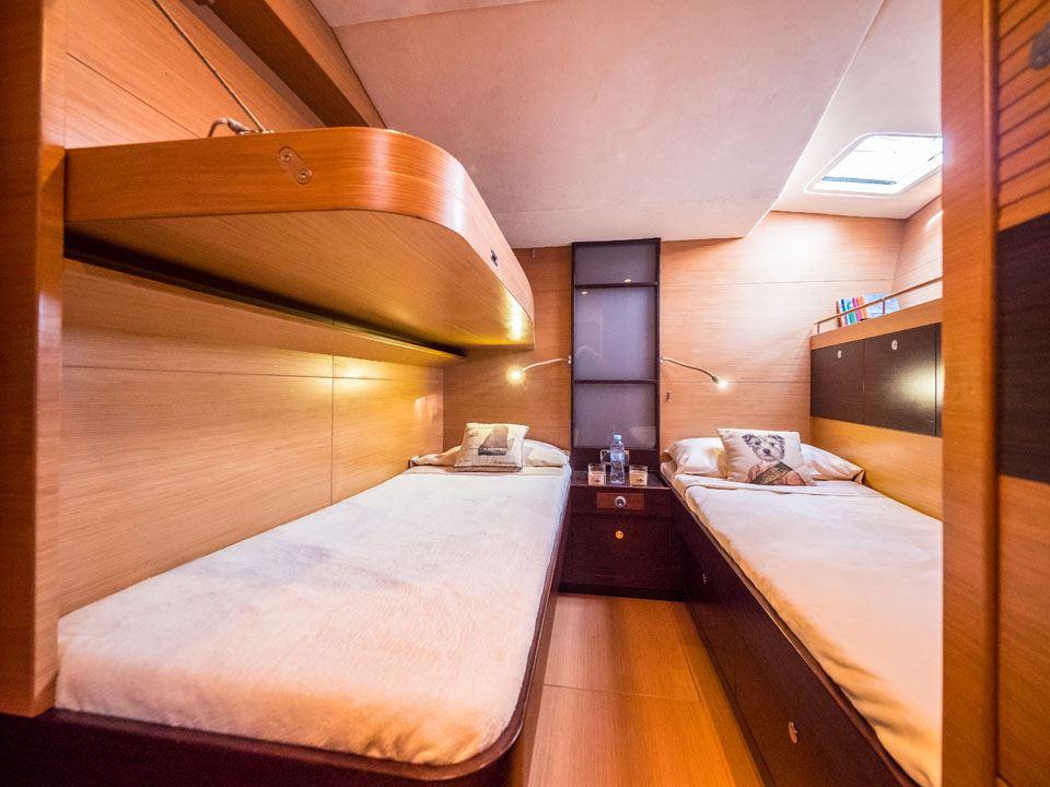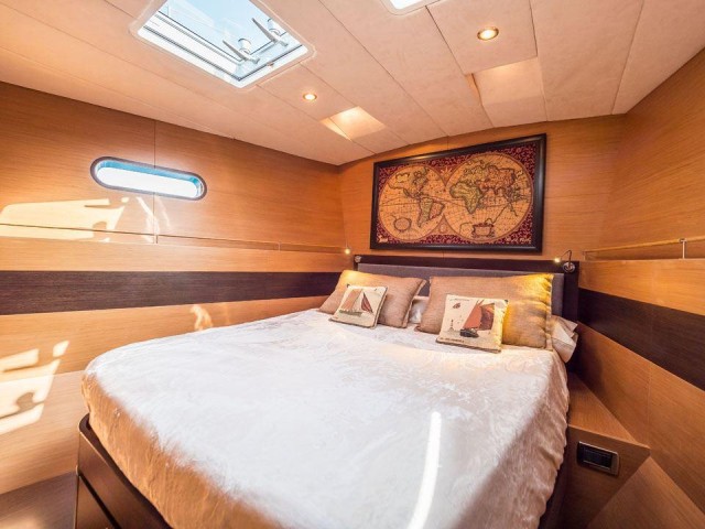 KALINDA accommodates up to seven guests in three well-appointed cabins, all with en-suite bathrooms. The layout includes two double cabins and one twin cabin with an additional Pullman bed, offering a flexible arrangement for families or small groups. Positioned forward of the bright and open saloon, the cabins provide a quiet and comfortable retreat. The interior is warm and understated, with a focus on natural light, soft materials and a calm, inviting atmosphere throughout.