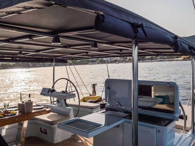Life on deck is central to the KALINDA experience. The cockpit offers a welcoming setting for al fresco dining, complete with an outdoor kitchen and grill, making it easy to enjoy long, relaxed meals while at anchor or underway. The deck layout is clean and well-balanced, allowing guests to move comfortably between lounging areas, sailing positions and the swim platform. Easy access to the water makes time at anchor especially enjoyable, whether swimming, relaxing or making use of the yacht’s water toys.