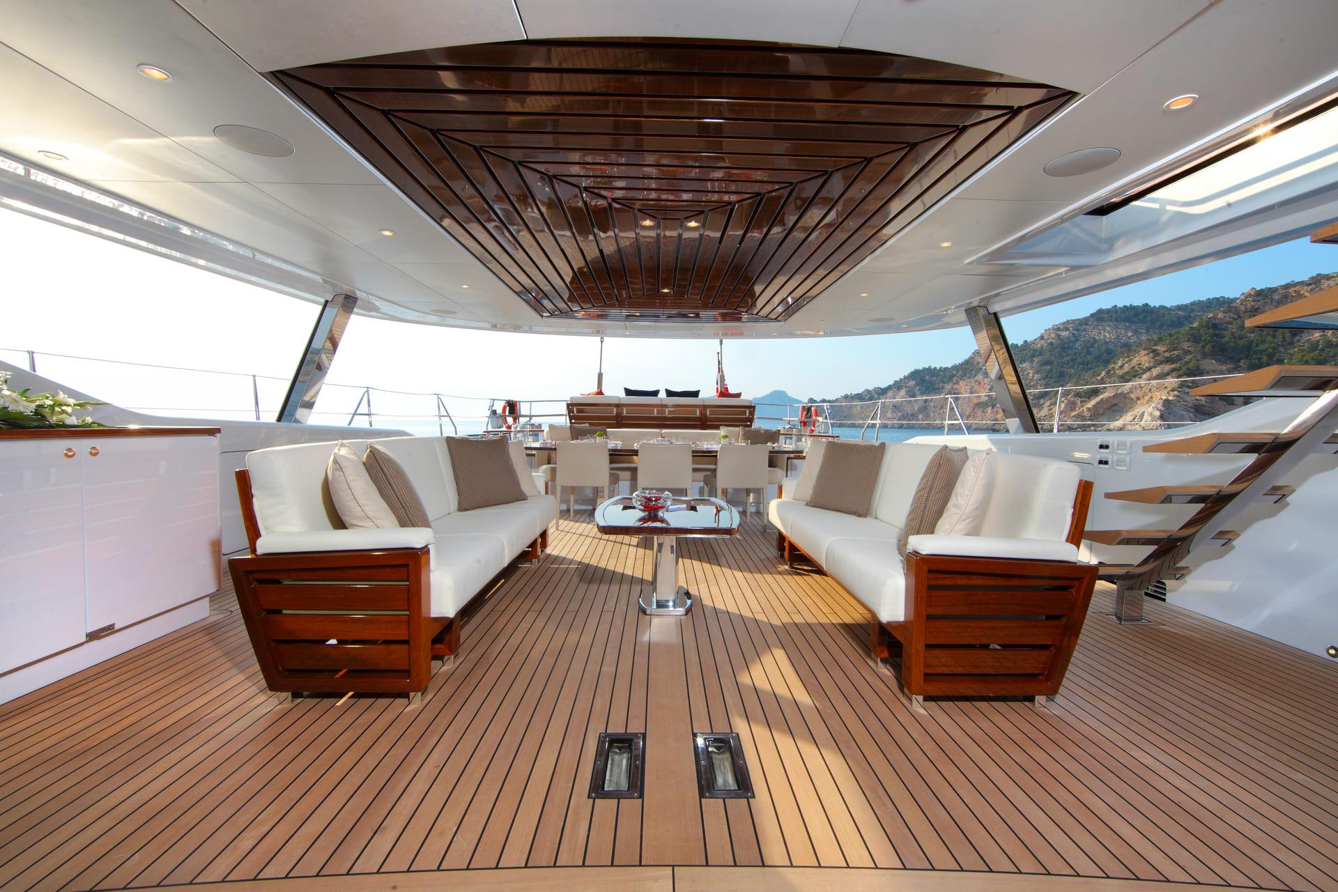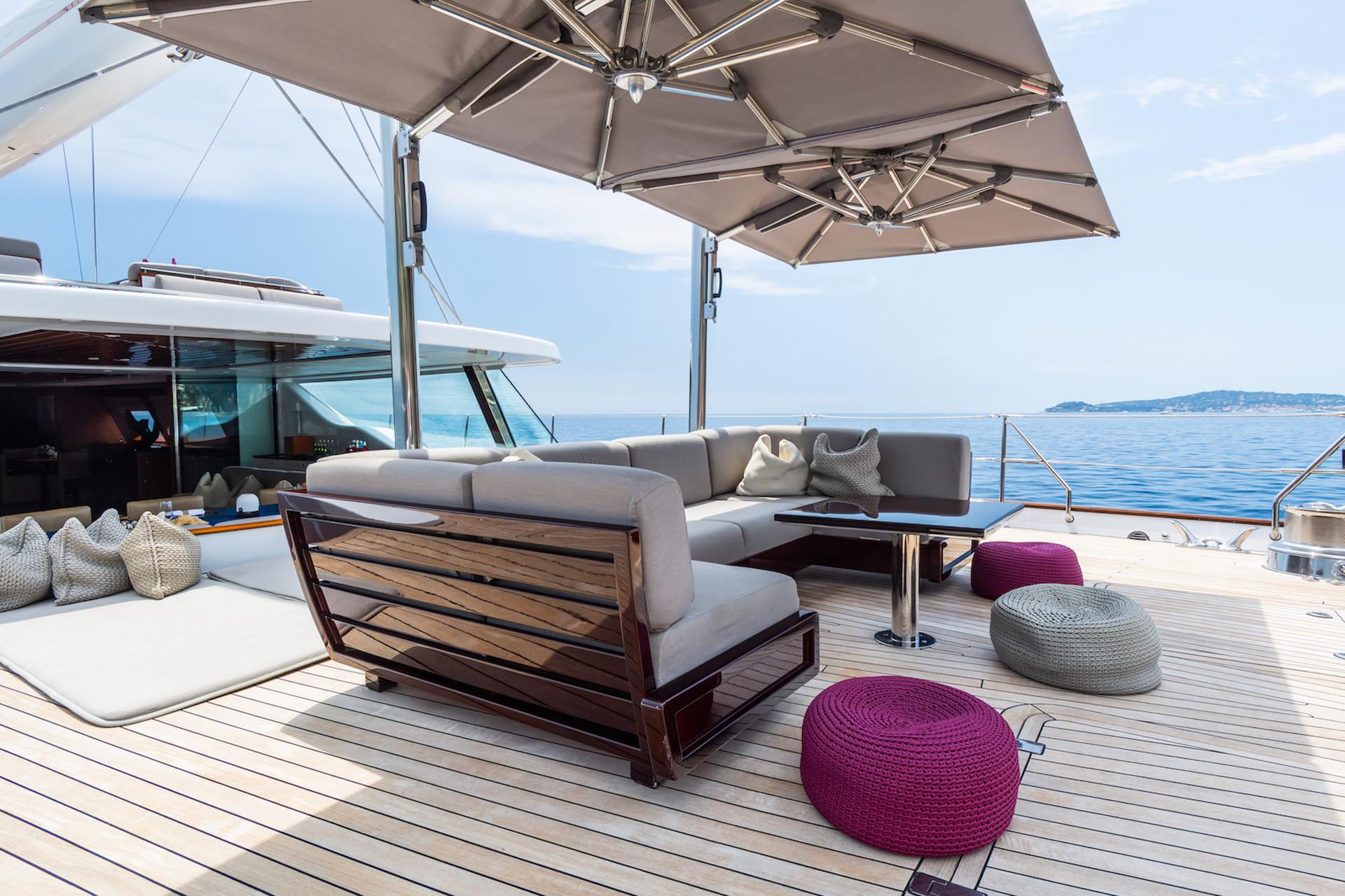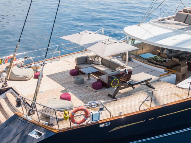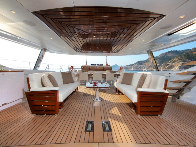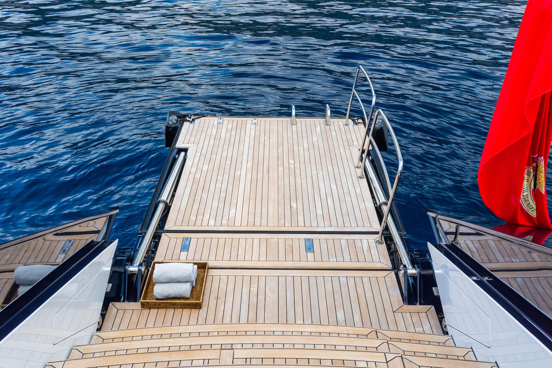 Outdoor living is central to life on Prana. Her foredeck spa pool is perfect for long, sun-drenched afternoons, while the generous aft deck provides al fresco dining and a 65" TV for magical open-air cinema nights under the stars. The flybridge offers additional lounging and social spaces, making it easy to enjoy both lively gatherings and quiet moments with panoramic views. A fold-down swim platform ensures effortless access to the sea for swimming or launching water toys.