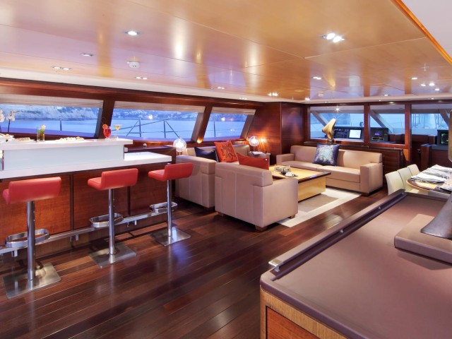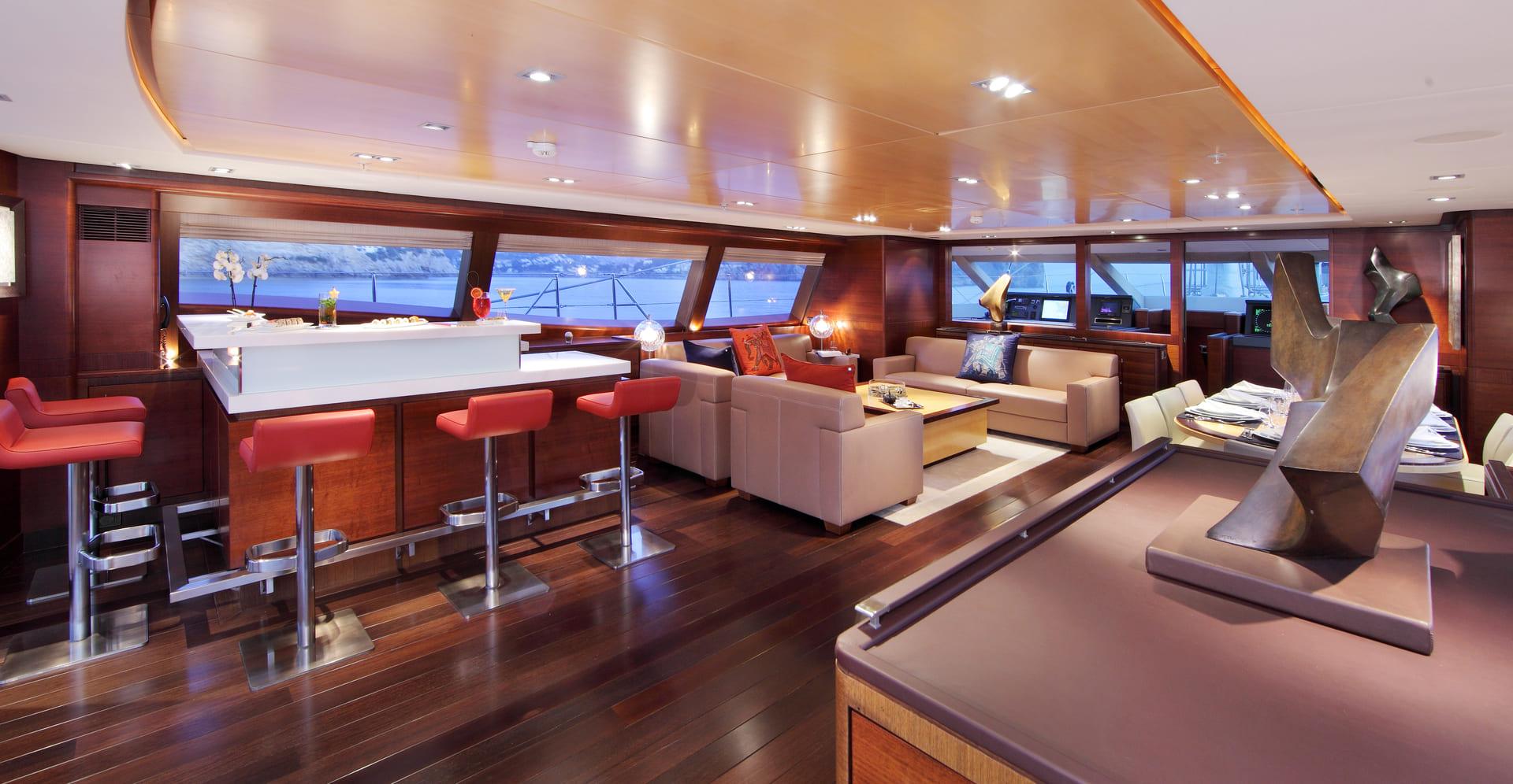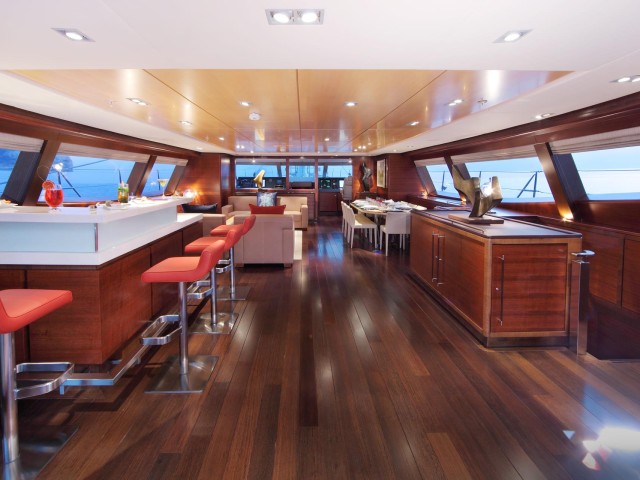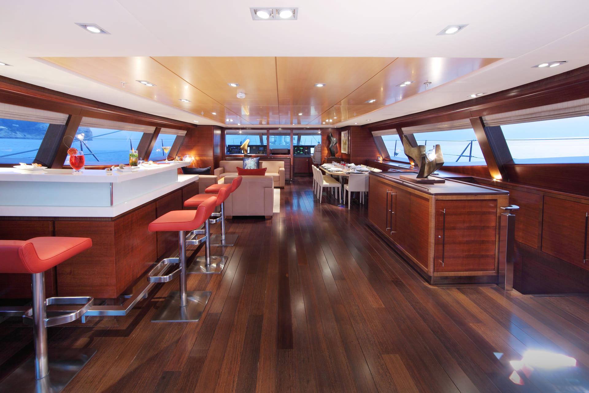 Her interiors reflect a sophisticated balance of rich woods and light, modern furnishings, creating a warm and welcoming atmosphere. The main salon offers abundant space for relaxation or social gatherings, enhanced by a Plex movie server, Smart TVs, and iPad-controlled AV throughout. With its natural flow of light and thoughtful design, Prana’s interior invites guests to unwind in refined style.
