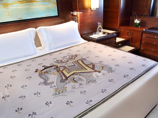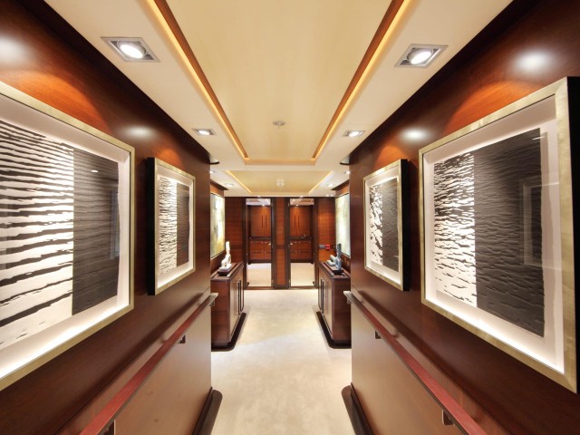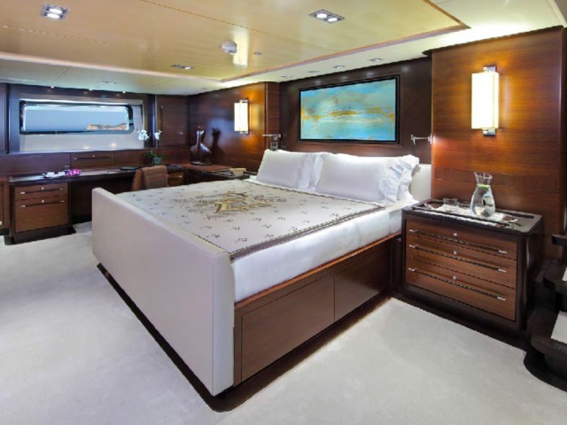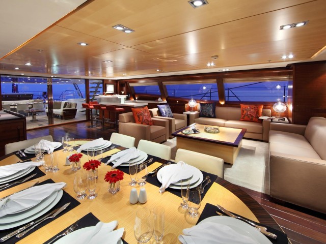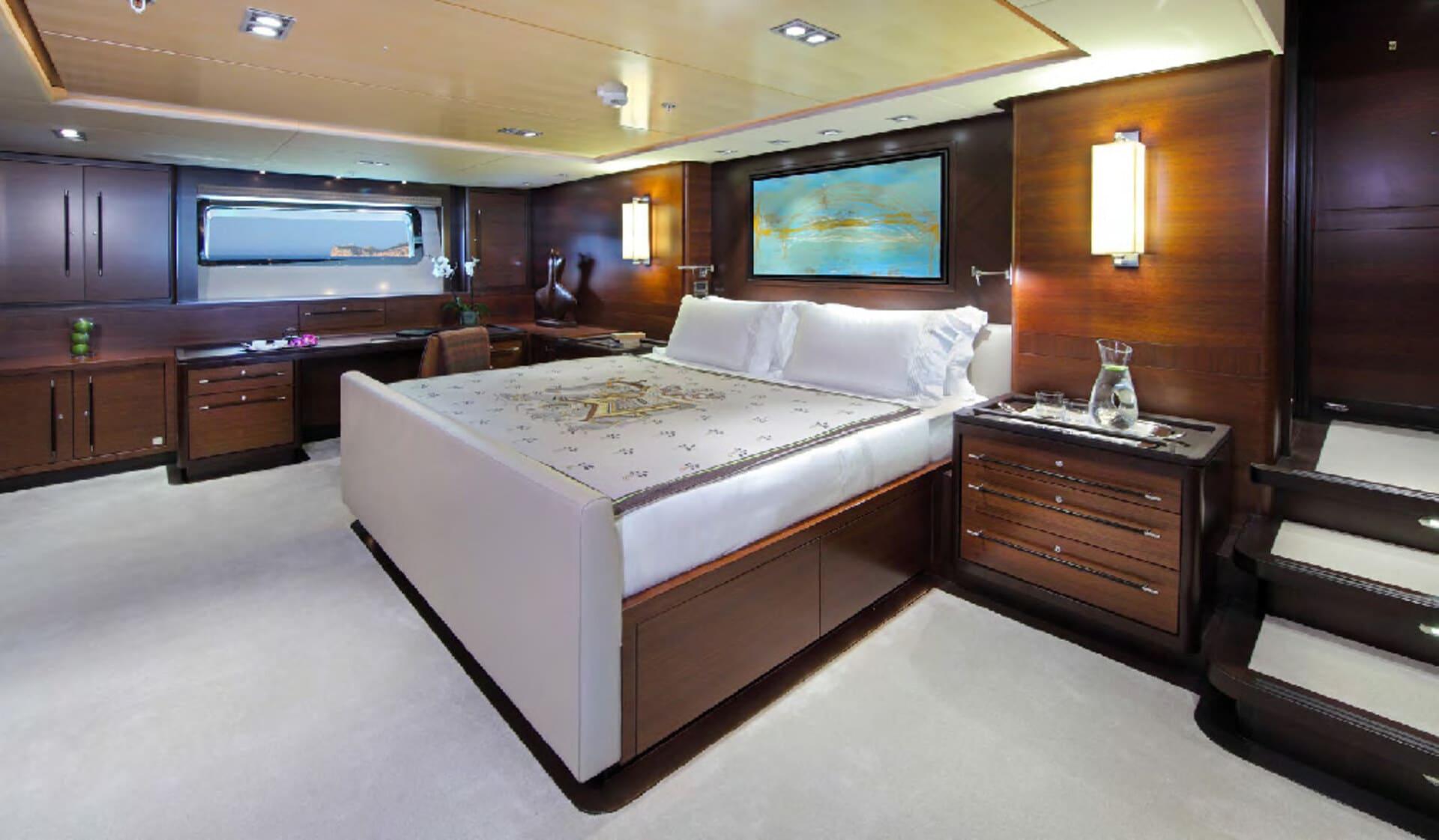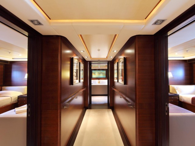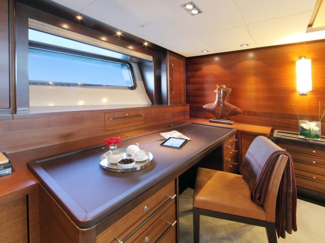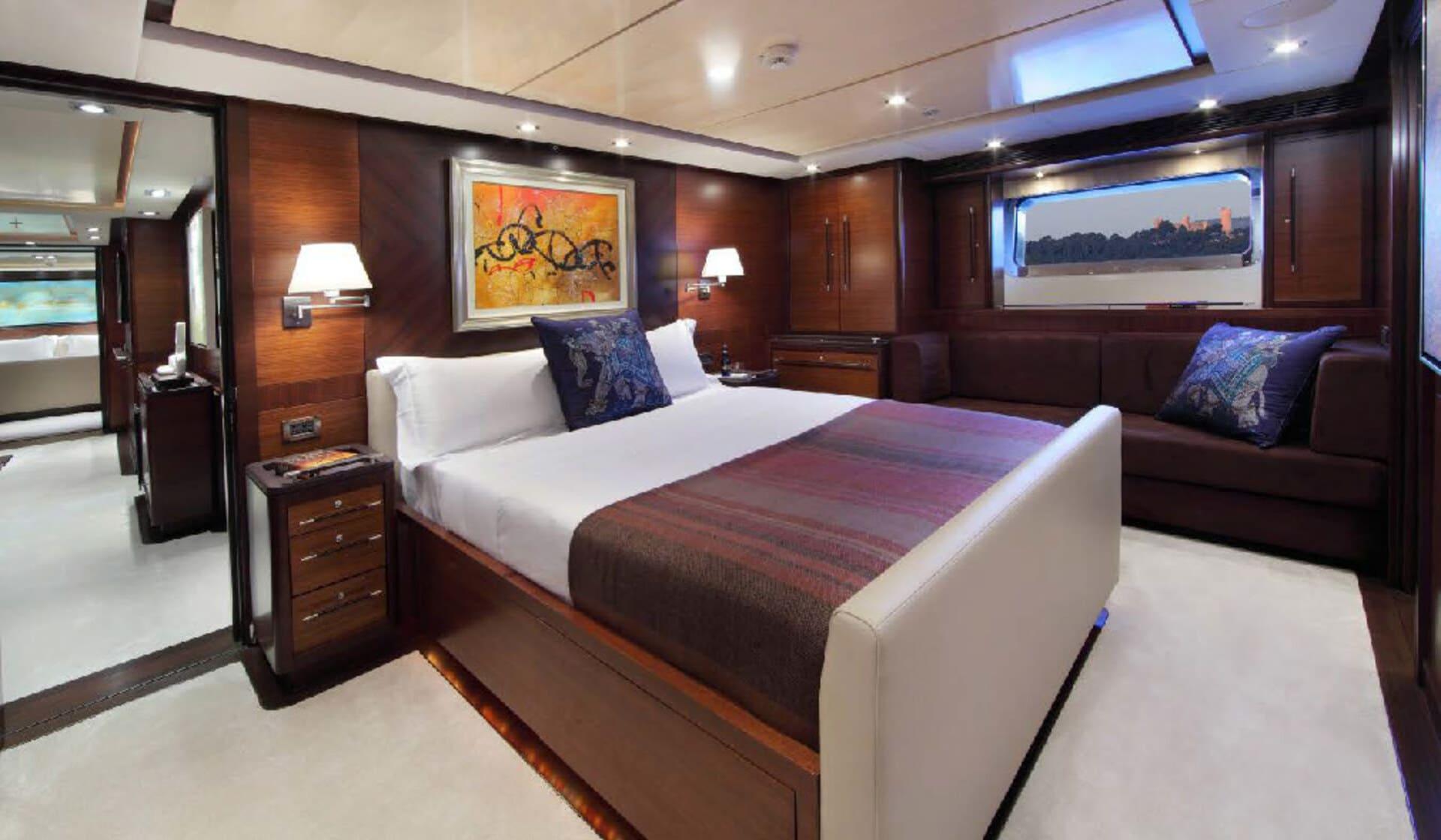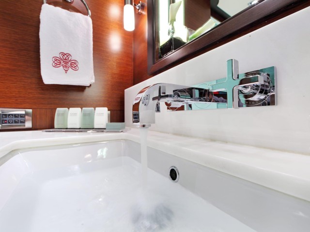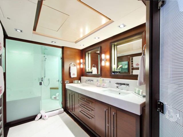 Prana welcomes up to 10 guests across five staterooms on the lower deck. The full-beam master suite sets the standard with a centreline king-size bed, a private study, a walk-in wardrobe, and a large en suite bathroom complete with both bath and shower. Two additional queen staterooms provide inviting retreats, while two twin staterooms—each with Pullman berths—add flexibility for families or groups. Although there are twelve berths, the owner prefers a maximum of eight guests on board, with 10 subject to prior approval. Every cabin has been designed for comfort, privacy, and understated elegance.